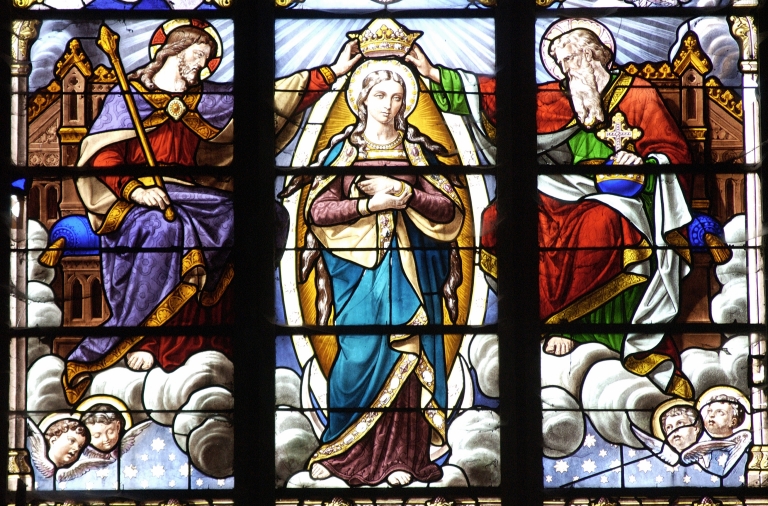 Verrières des baies 0, 1, 2, 7, 9, 11, 13, 15, 17 à 20, 00 : Scènes de la Vierge, Saint Joseph et l´Enfant, Enfant de Marie, Ange gardien, Sainte Hélène, Don des clés, Sainte Avoye, Saint Louis, Baptême du Christ, saint évêque, Don du Rosaire,