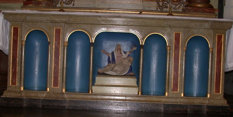 Ensemble du maître-autel : autel, tabernacle, 2 gradins d'autel, retable, degré d'autel,
