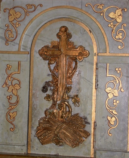 Décor du portillon du tabernacle : croix, blé, vigneImmatriculation