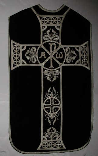Ornement noir 1 : chasuble, bourse de corporal, étole, manipule, voile de calice (Saint-Pierre-de-Plesguen fusionnée en Mesnil-Roc'h en 2019),