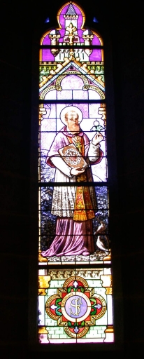 Ensemble des 4 verrières à personnages des baies 1, 3, 5, 7 : saint Augustin, Sacré Coeur, saint non identifié, saint Ignace, et des 2 verrières décoratives des baies 9 et 11,