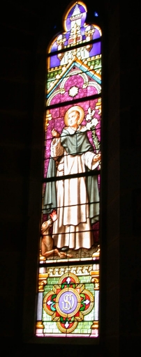 Ensemble des 5 verrières à personnages des baies 2, 4, 6, 8, 10 : saint Jean-Baptiste, Vierge à l'Enfant, sainte Anne et la Vierge, saint Dominique, saint Gabriel,