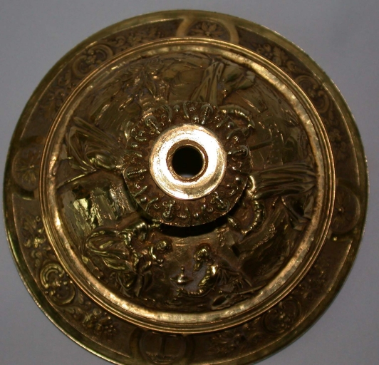 Chapelle d'orfèvrerie dans sa boîte : calice, patène, 2 burettes et leur bassin, clochette,