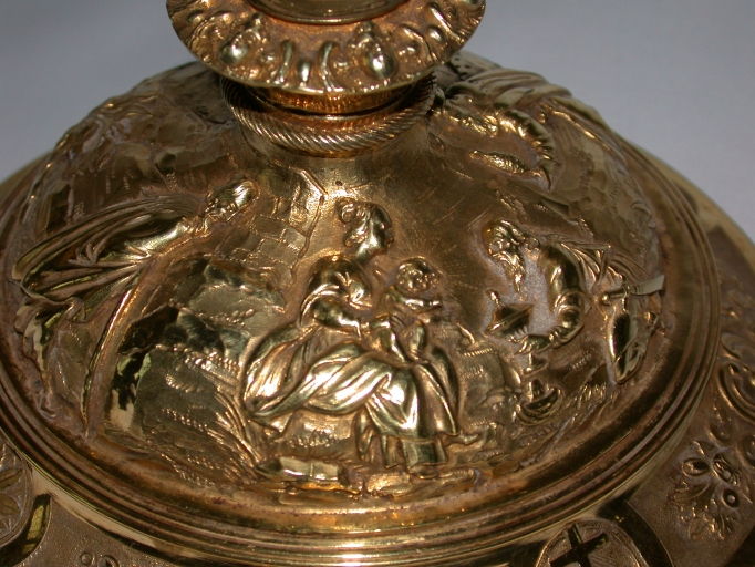 Chapelle d'orfèvrerie dans sa boîte : calice, patène, 2 burettes et leur bassin, clochette,