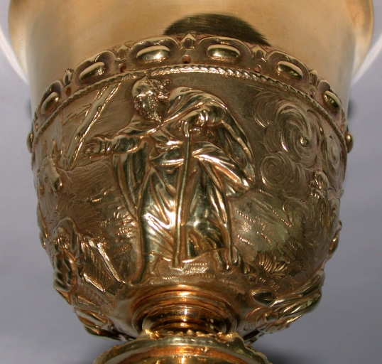 Chapelle d'orfèvrerie dans sa boîte : calice, patène, 2 burettes et leur bassin, clochette,
