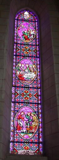 Ensemble des 3 verrières du choeur : Passion, des 2 verrières du transept : Sainte famille, Vierge à l'Enfant, saint Dominique et des 16 verrières décoratives de la nef,