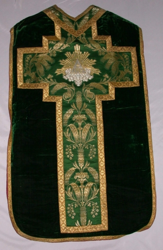 Ornement vert 1 : chasuble, bourse de corporal, étole, manipule, voile de calice,