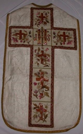 Ornement blanc 1 : chasuble, bourse de corporal, étole, manipule, voile de calice,