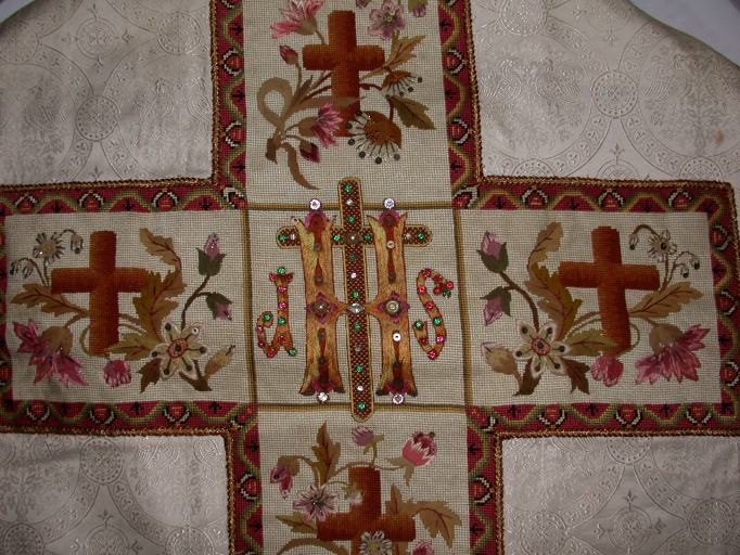 Ornement blanc 1 : chasuble, bourse de corporal, étole, manipule, voile de calice,