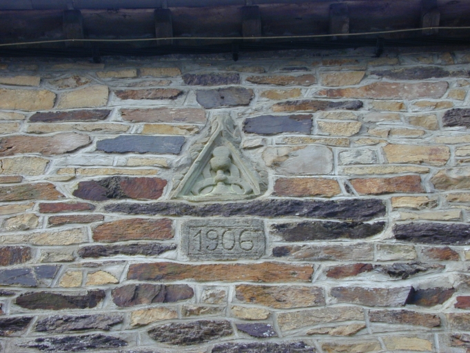 Façade antérieure, élément d'architecture et pierre gravée d'une date : détailImmatriculation