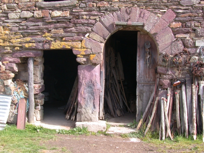 Façade, détail, ancienne porte double en plein cintre à claveaux de schisteImmatriculation