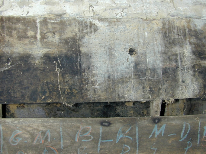 Intérieur : détail du linteau de cheminée daté '1632', portant la croix et le H stylisés caractéristiques des logis de prêtresImmatriculation