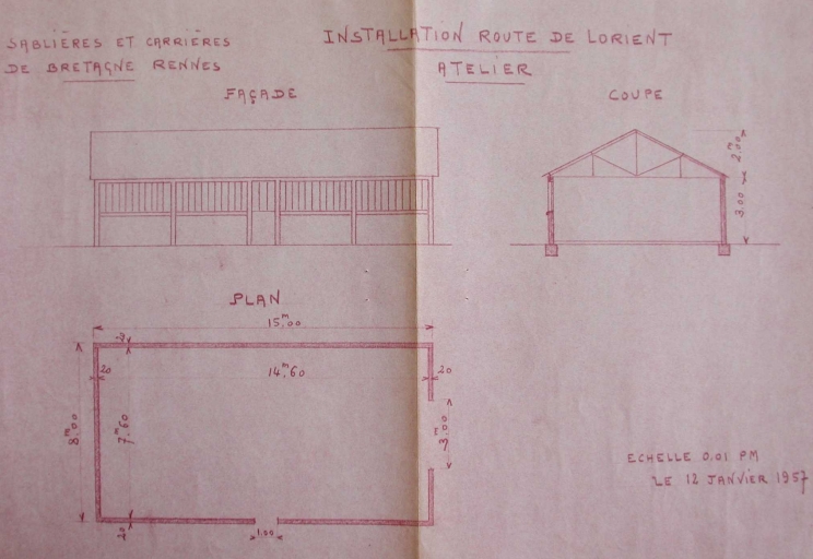 Atelier. Plan, élévation et coupe, 1957 (A. C. Rennes)Immatriculation