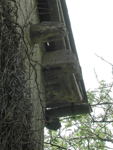 Détail sur les pièces de bois saillant du pignon est du logis probablement remonté en terreImmatriculation