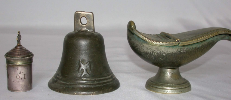 Ampoule à huile des malades, clochette et navette à encensImmatriculation