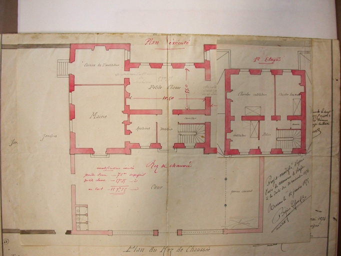 4e projet d'une mairie-école, plan du rez-de-chaussée, par Bézier-Lafosse, vu et approuvé le 23 avril 1875Immatriculation