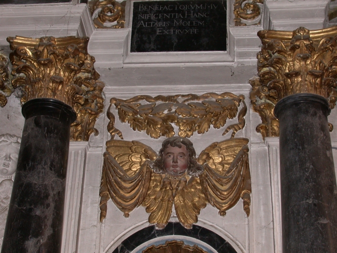 Retable, partie supérieure de la niche de saint Sulpice : angelot, guirlande de feuilles et inscriptionImmatriculation