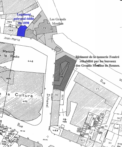 Moulin à foulon, puis moulin à blé de Saint-Hélier, actuellement minoterie dite Grands Moulins de Rennes, 17 rue Jean-Marie Duhamel (Rennes),