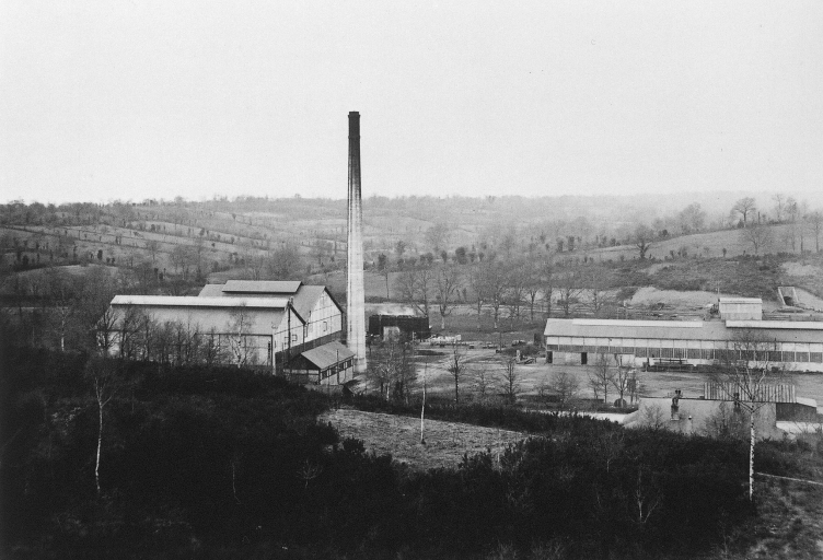 Photographie ancienne : de gauche à droite se situent la centrale électrique et la chaufferie avec cheminée d'usine en béton ; le bâtiment réfrigérant l'eau pour l'air comprimé ; l'atelier de réparation ; et la galerie Sainte-Barbe, au fond.Immatriculation