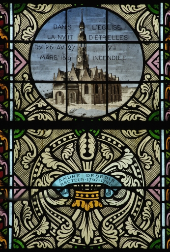 Un vitrail représentant l'ancienne égliseImmatriculation