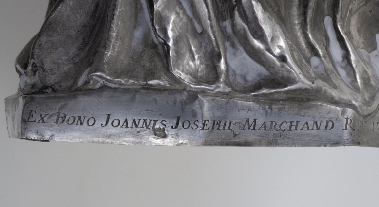 Statue-reliquaire : base, détail inscriptionImmatriculation