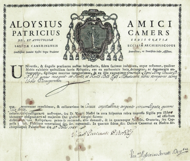 Croix-reliquaire : certificat d'authenticité des reliques (1788)Immatriculation