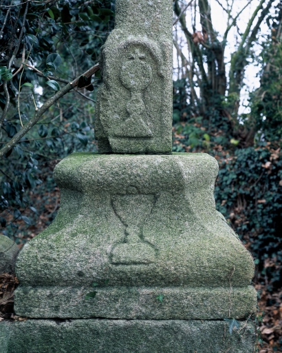 Détail de la base du fût avec ciboire et du socle sculpté d'un calice.Immatriculation