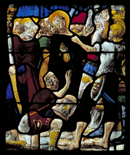 Verrière nord, détail 2e registre, panneau droit : le Christ recollant l'oreille du centurion.Immatriculation
