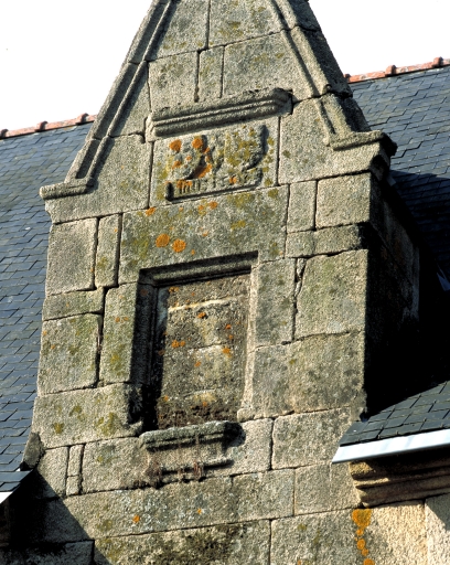 Lucarne médiane avec date de 1555, inscription et blasons.Immatriculation
