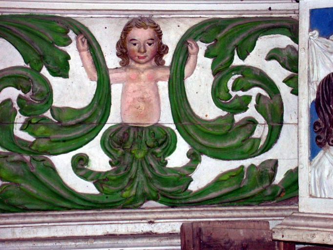 Soubassement des ailes, détail des angelots engainés tenant des rinceauxImmatriculation