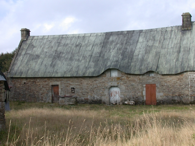 Alignement repéré comprenant un logis-étable 17e siècle et un logis à deux pièces daté 1863. Vue sud du logis-étable. 1987 XB 73, 74, 75Immatriculation