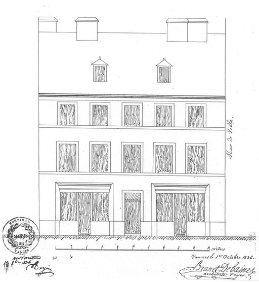 Projet d'élévation du n°1 rue Saint-Vincent par Brunet-Debaines. AM Vannes 1M.Immatriculation