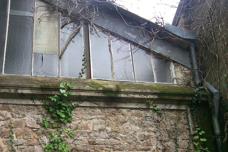 Halle transversale, élévation nord, détail pignon vitré.Immatriculation