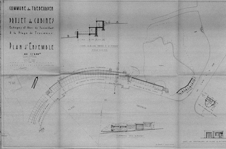 Projet de cabines, plage de Tresmeur, plans et élévation, par François Rousseau architecte, janvier 1967.Immatriculation