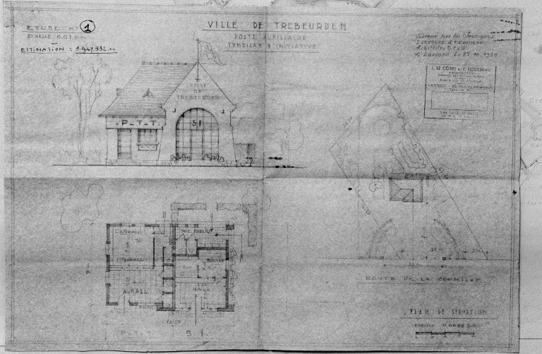 Ville de Trébeurden, poste auxilliaire, syndicat d'initiative. Etude n°1 (non réalisée), plan et élévation, par Jean Le Corre et François Rousseau, 1950Immatriculation