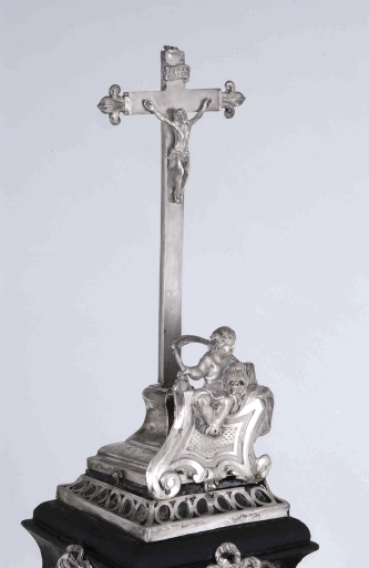 Châsse-reliquaire : partie supérieure, vue rapprochée de trois-quartsImmatriculation