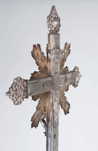 Croix de procession : détail de la croix, vue biaise de la ViergeImmatriculation