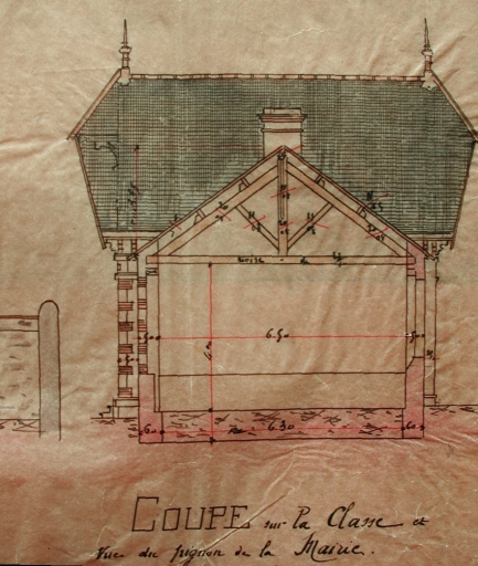 Premier projet de construction du groupe scolaire. Coupe sur la classe et le pignon de la mairie par Victor le Guen, le 21 octobre 1907 (AD 22).Immatriculation