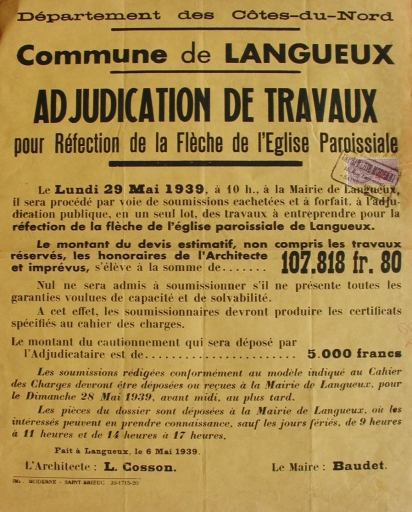 Adjudication de travaux pour réfection de la flèche de l'église en 1939.Immatriculation