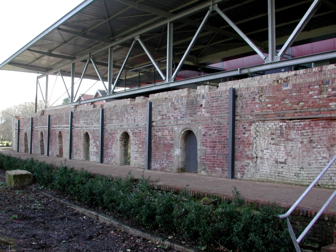 Vue générale de la galerie du four prise depuis l'extérieur. L'élévation est rythmée par six portes d'enfournement permettant d'alimenter le four en produits.Immatriculation