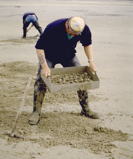 Pêcheur utilisant la grèle pour cribler les coquesImmatriculation