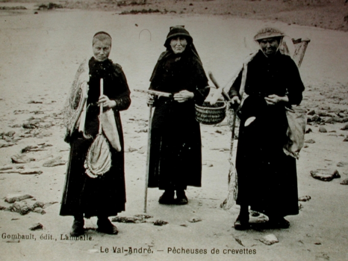 Pêcheuses de crevette du Val André avec haveneau cerclé, havenet en croix et râteauImmatriculation