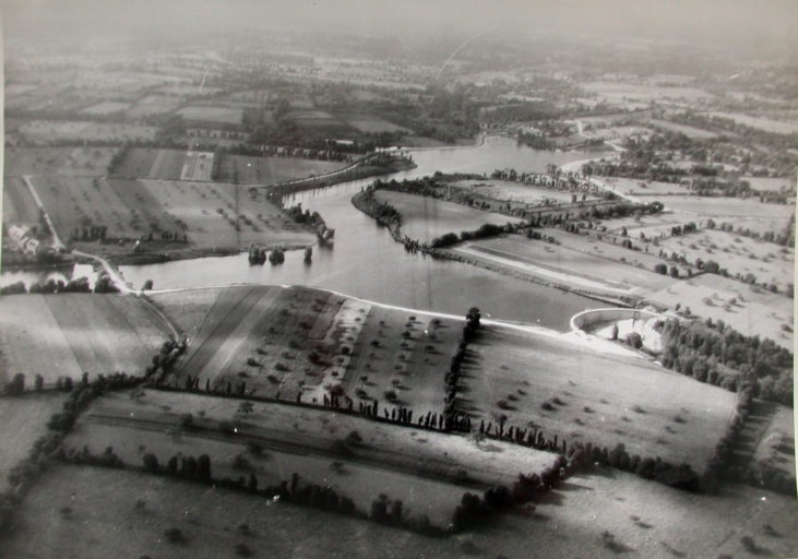 Barrage de Bobital et étang du Val desservant l'usine des eaux, vue aérienne (1960).Immatriculation