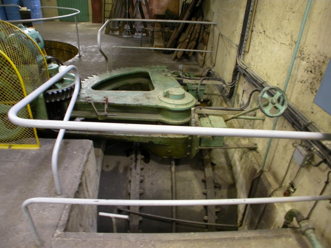 Détail d'une des deux conduites forcées en métal et d'une des deux vannes de pied situées juste en amont des turbines.Immatriculation