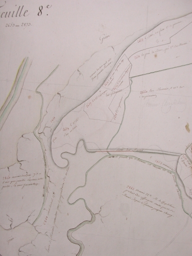 Extrait du cadastre du Penthièvre de1785 (feuille n° 8) : tracé des digues et des cours d'eau (l'Urne, la Camois), marais innondé, propriété des Aubiers (parcelle n° 2861)Immatriculation