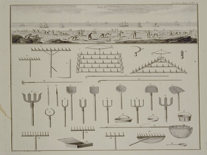 Tableau des outils de pêche à pied en baie de Saint-Brieuc (planche gravée de Duhamel du Montceau, Traité des pesches, 18e siècle)Immatriculation