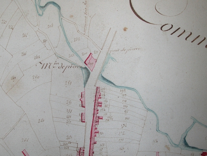Cadastre 1812 : moulin de Pierre (B 199), pont de Pierre et ancienne voie romaineImmatriculation