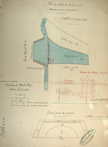 Plan, profils en long et en travers des ouvrages régulateurs du moulin Héry, 1882 (AD 22)Immatriculation
