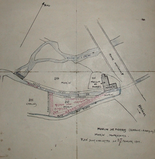 Moulin de Pierres en 1914, propriété de M°. Morin : projet de réserve d'eau à constituer selon la réglementation de 1877Immatriculation