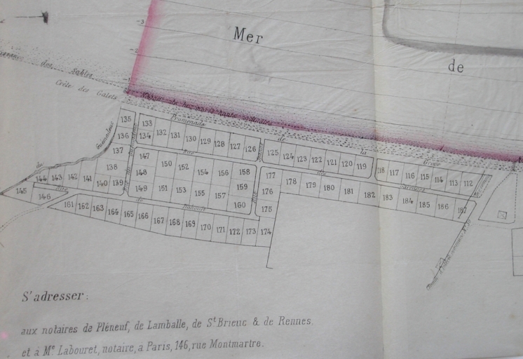 Projet de lotissement des graviers des Garennes, extrait de plan du 5 août 1882 (Guillomoto, ingénieur ordinaire des Ponts-et-Chaussées / AD 22).Immatriculation